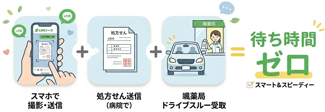 車から降りずに処方せんの受付・お薬の受け取りが出来ます! ドライブスルーで受付・受取がスムーズです! もちろん通常窓口でもご利用できます。 どこの医療機関の処方せんも受付いたします。 各種キャッシュレス対応 |